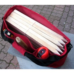 Strong bag Three pockets for accessories Double well-sewn strap, protection against rupture in both sides Protection sponge against the abrasions of the skin in one side Adjustable belt dimensions length: 67cm Height: 33cm base width: 13cm Fits with the two sets wooden stakes, dimensions from 50 cm to 2.5 cm